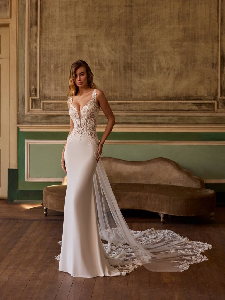 Abito da sposa manica canotta, stile sirena, scollatura spalle aperta e tessuto satin
