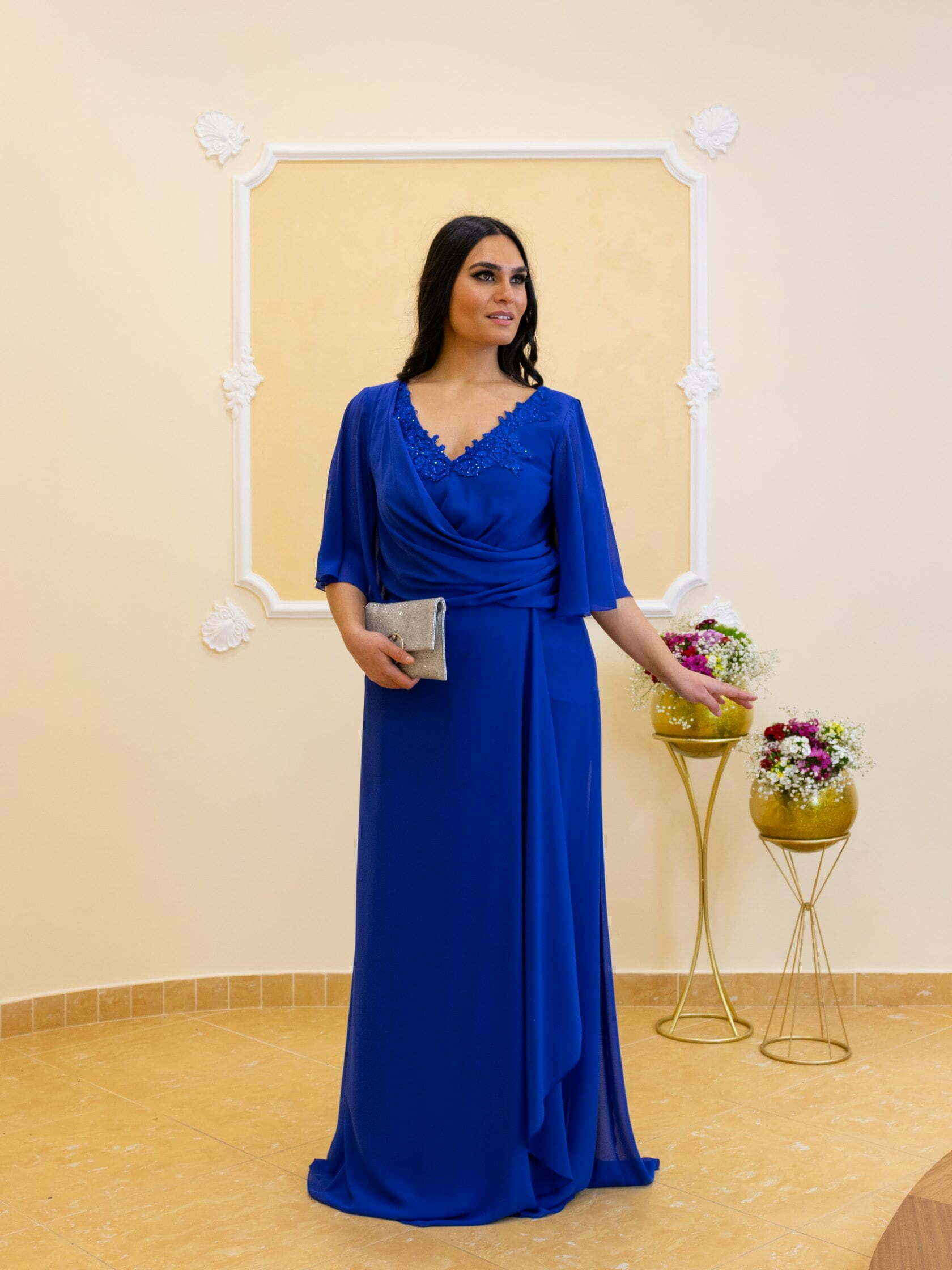 Abito lungo da cerimonia in tessuto organza e pizzo