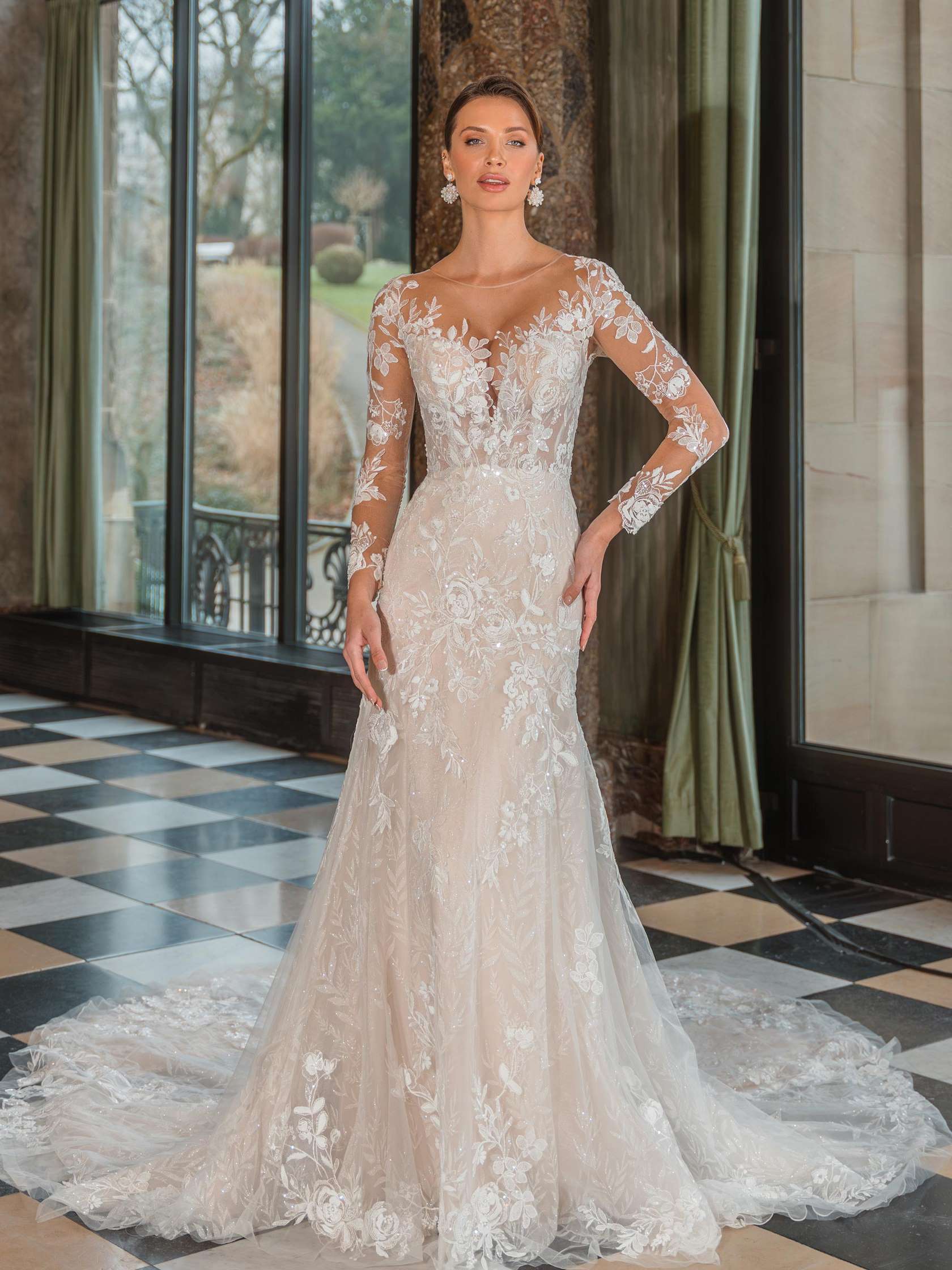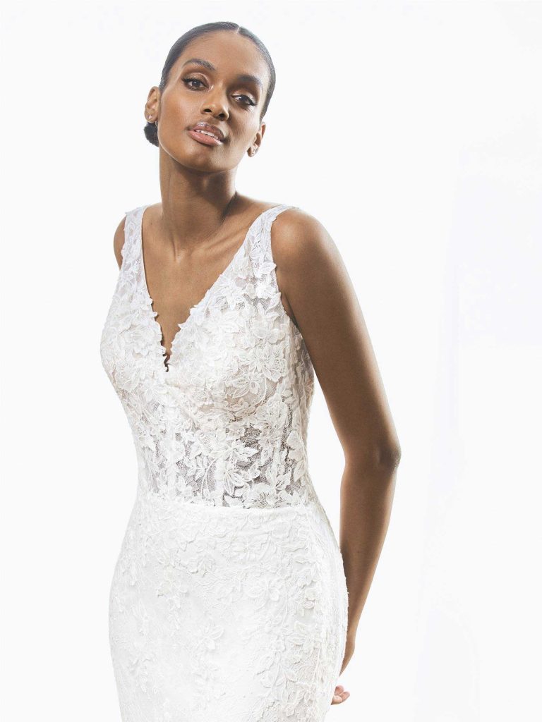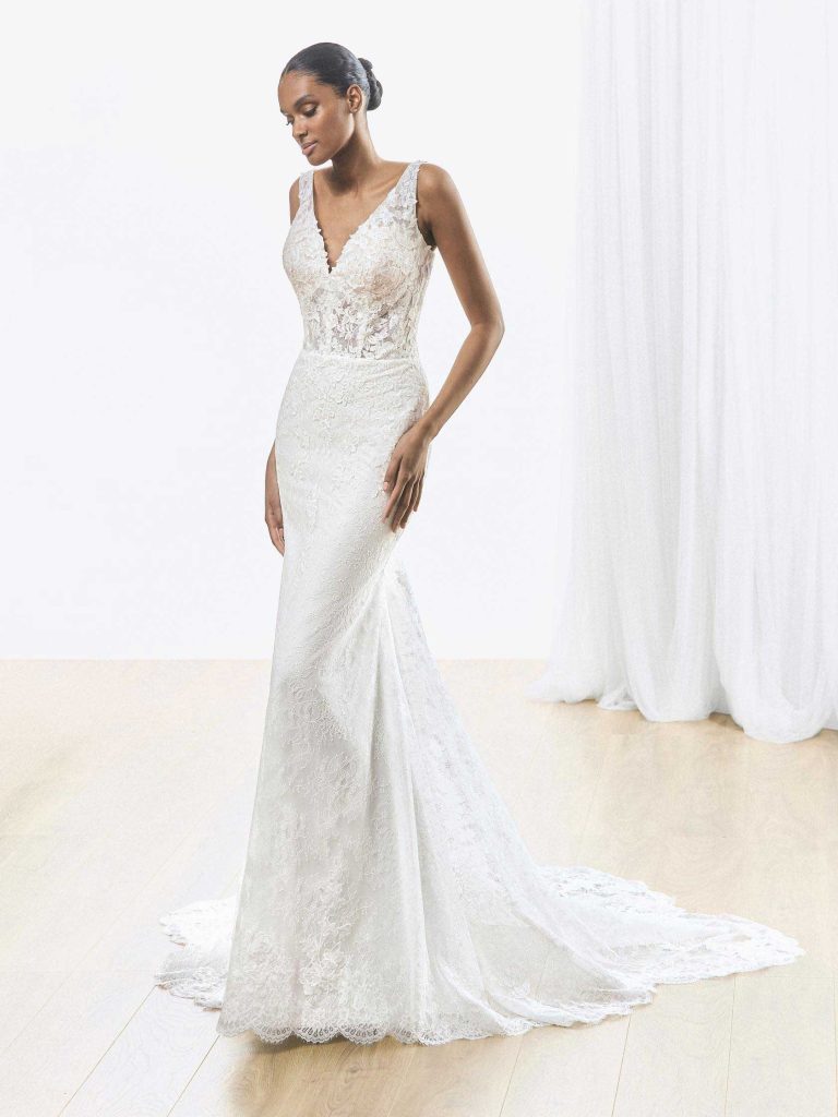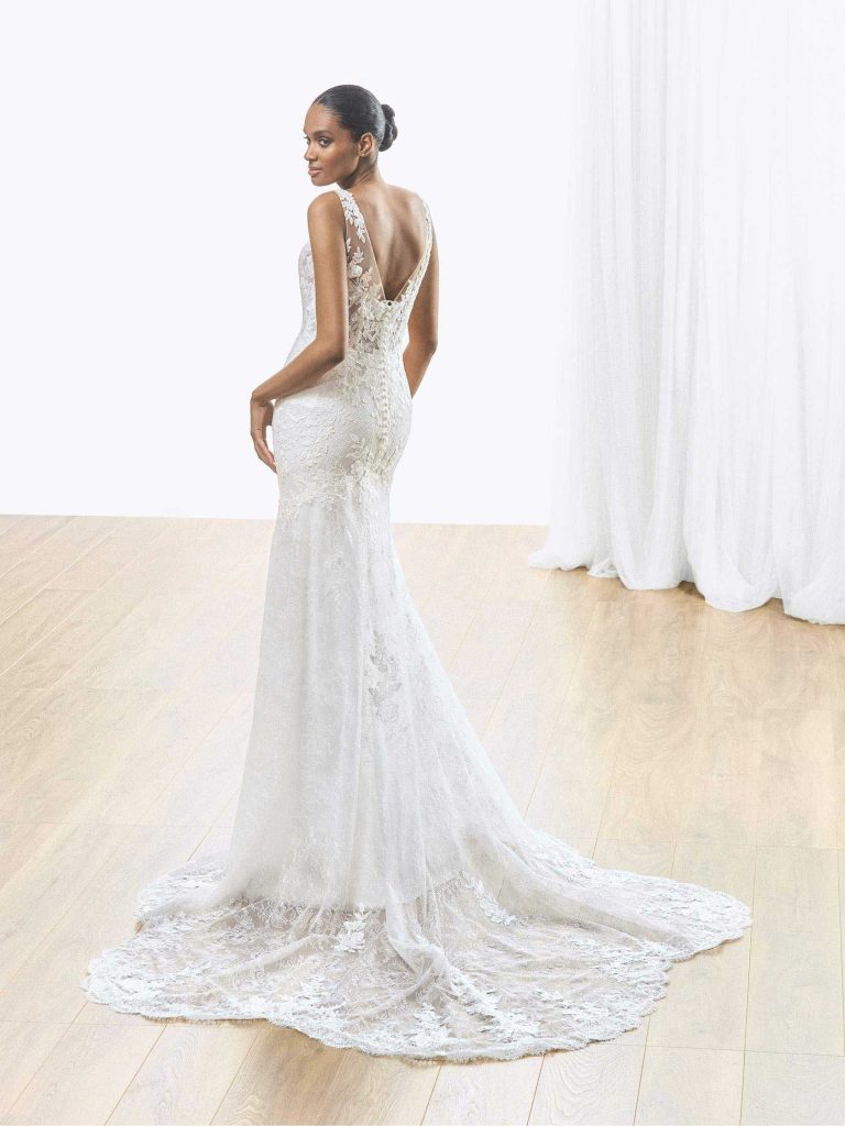 Abito da sposa manica canotta, stile sirena, scollatura spalle aperta e tessuto pizzo