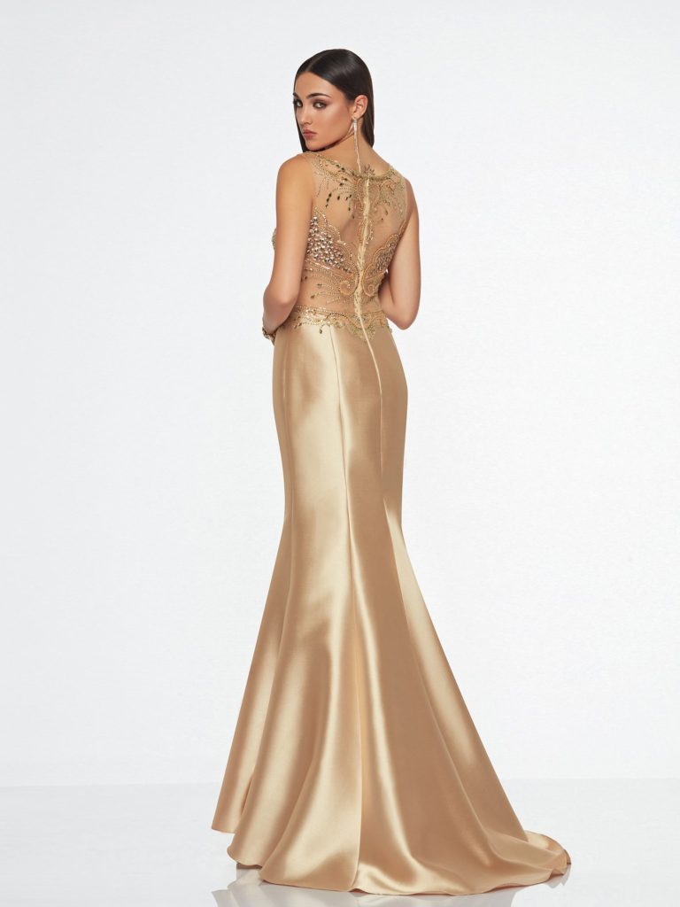 Abito lungo da cerimonia in tessuto mikado e pizzo