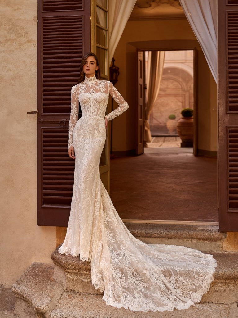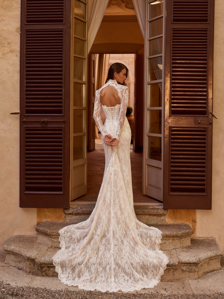 Abito da sposa maniche lunghe, stile sirena, scollatura spalle a goccia e tessuto pizzo
