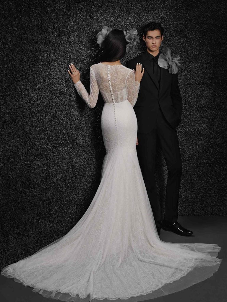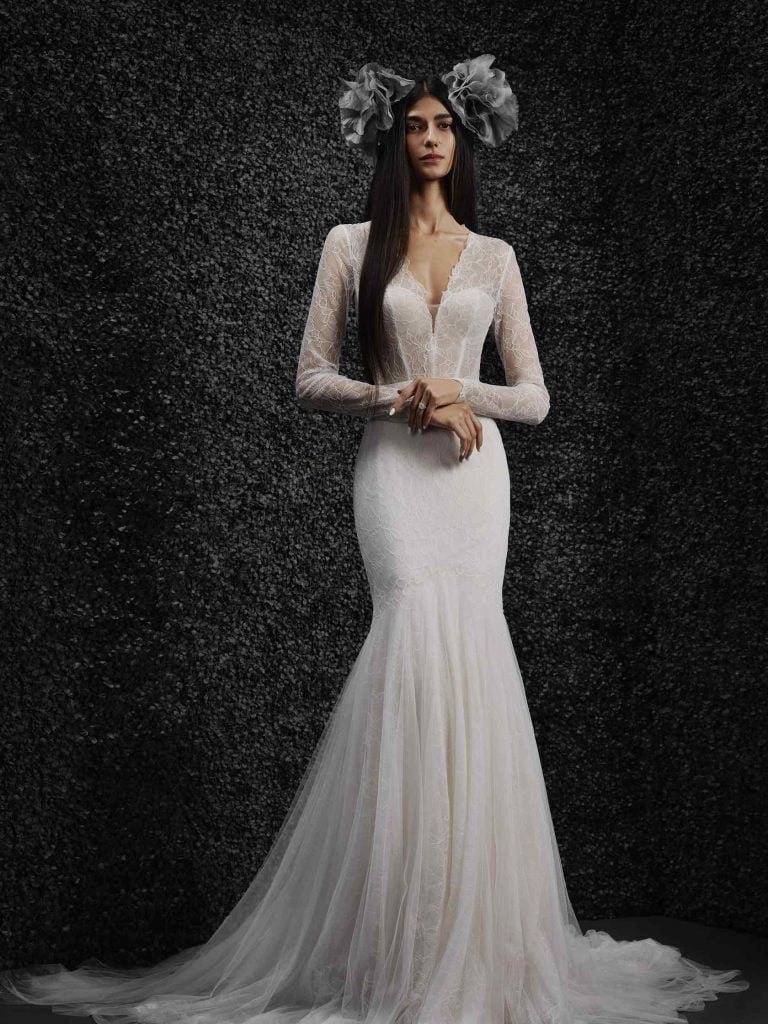 Abito da sposa maniche lunghe, stile sirena, scollatura spalle a v e tessuto organza