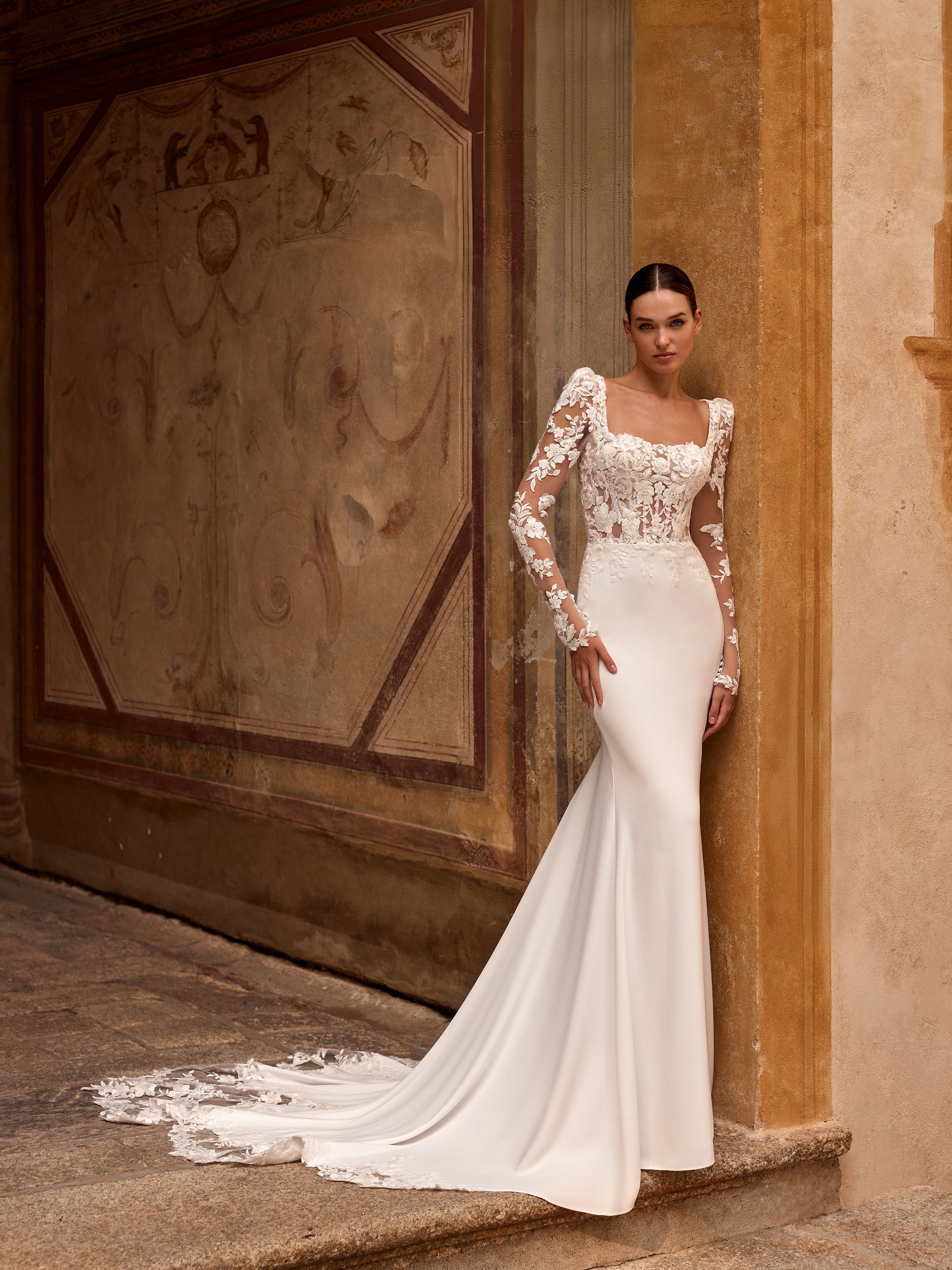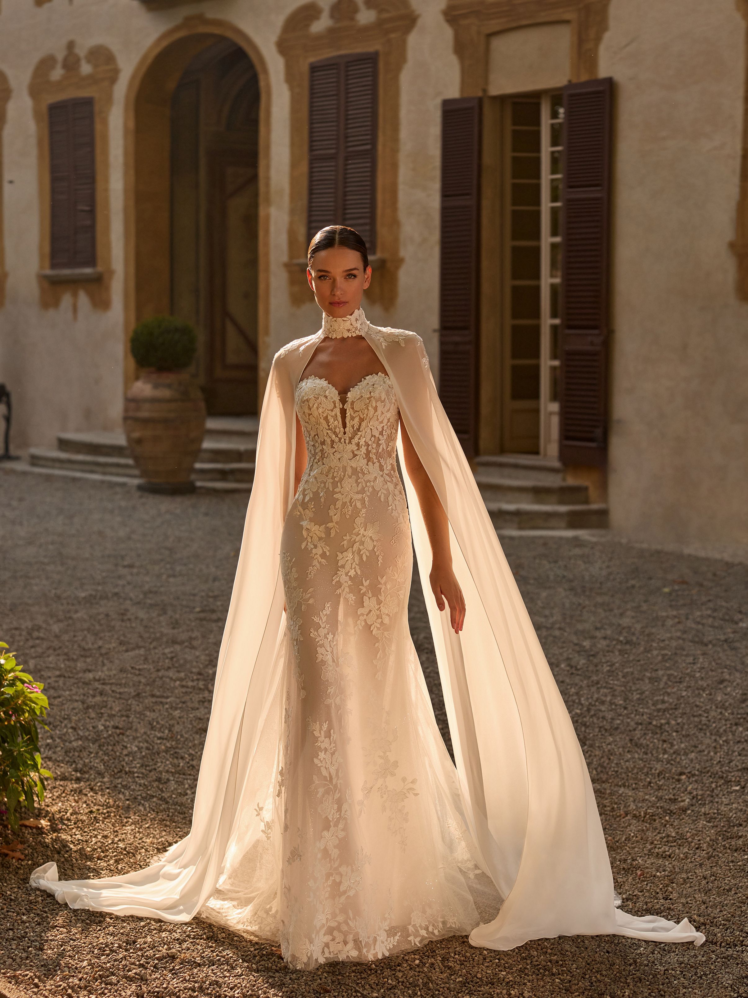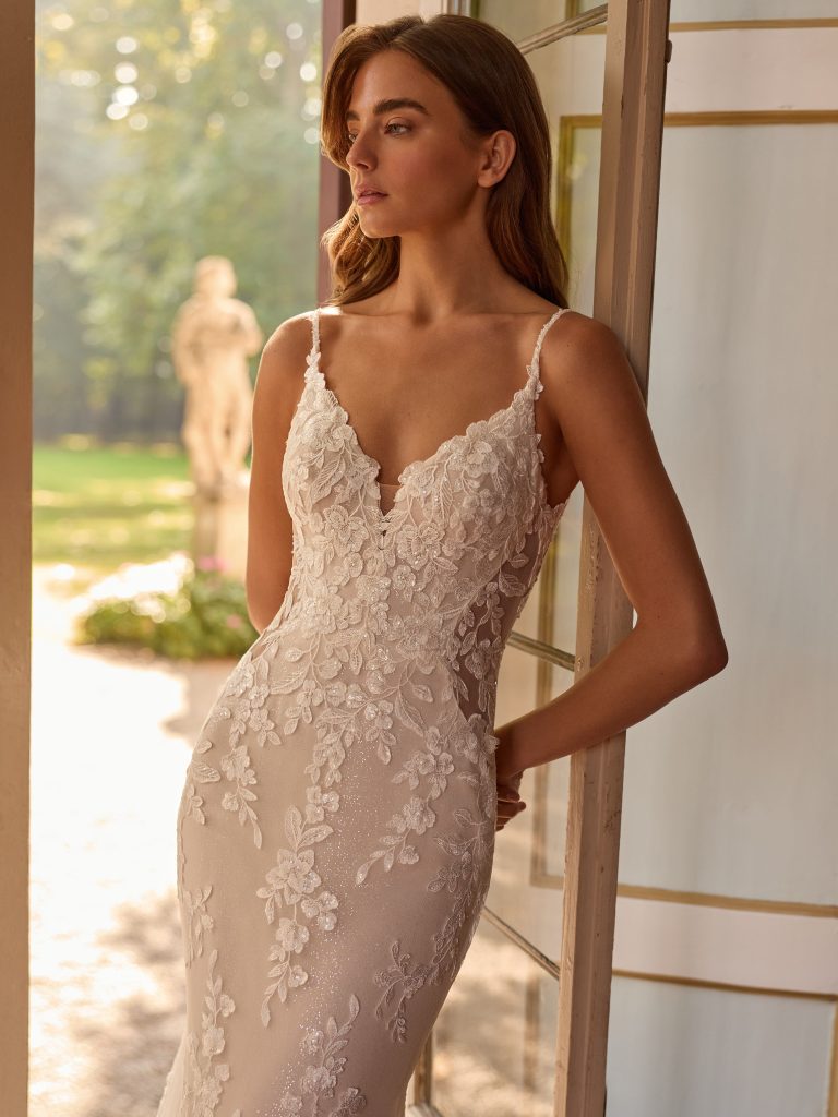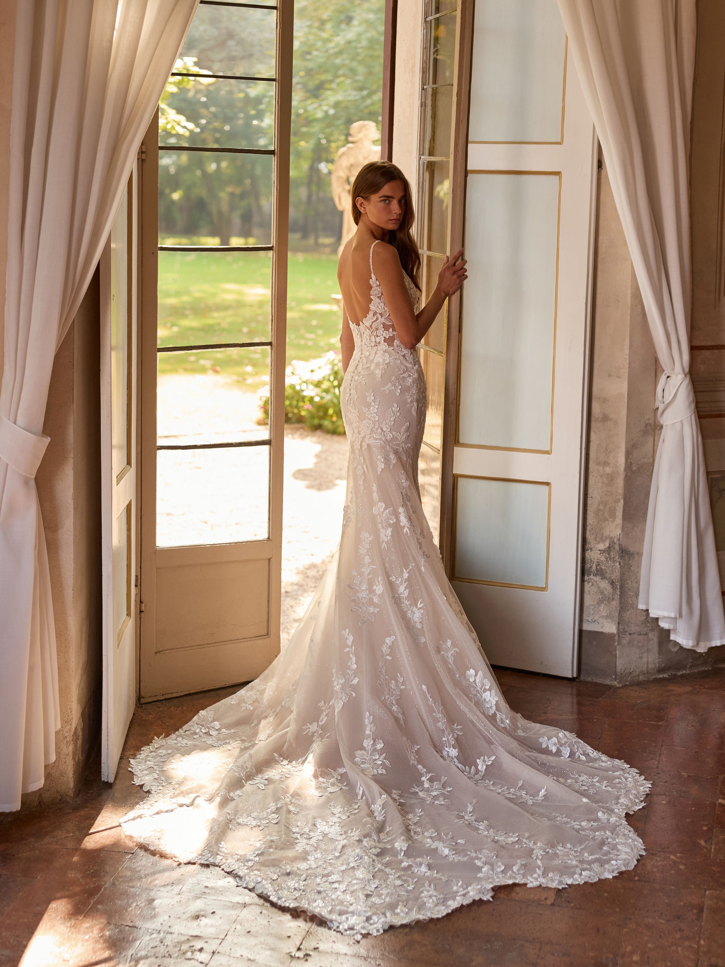 Abito da sposa manica canotta, stile sirena, scollatura spalle aperta e tessuto pizzo