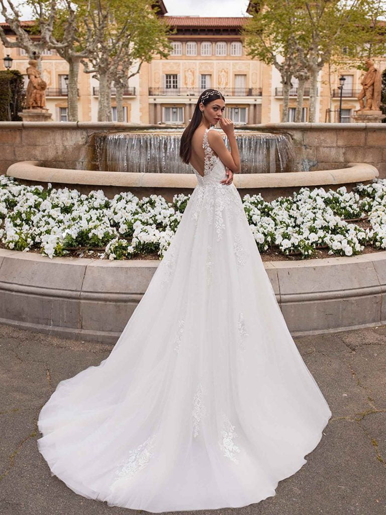 Abito da sposa canotta, stile principessa, scollatura spalle aperta e tessuto organza