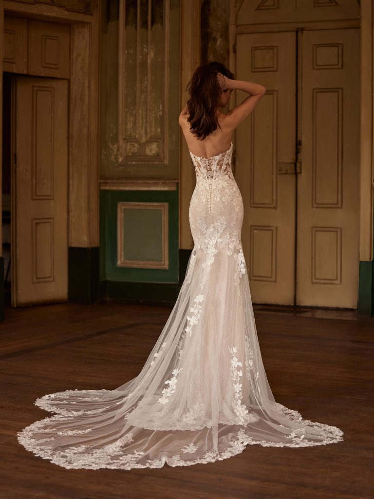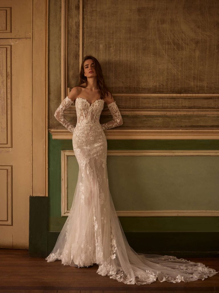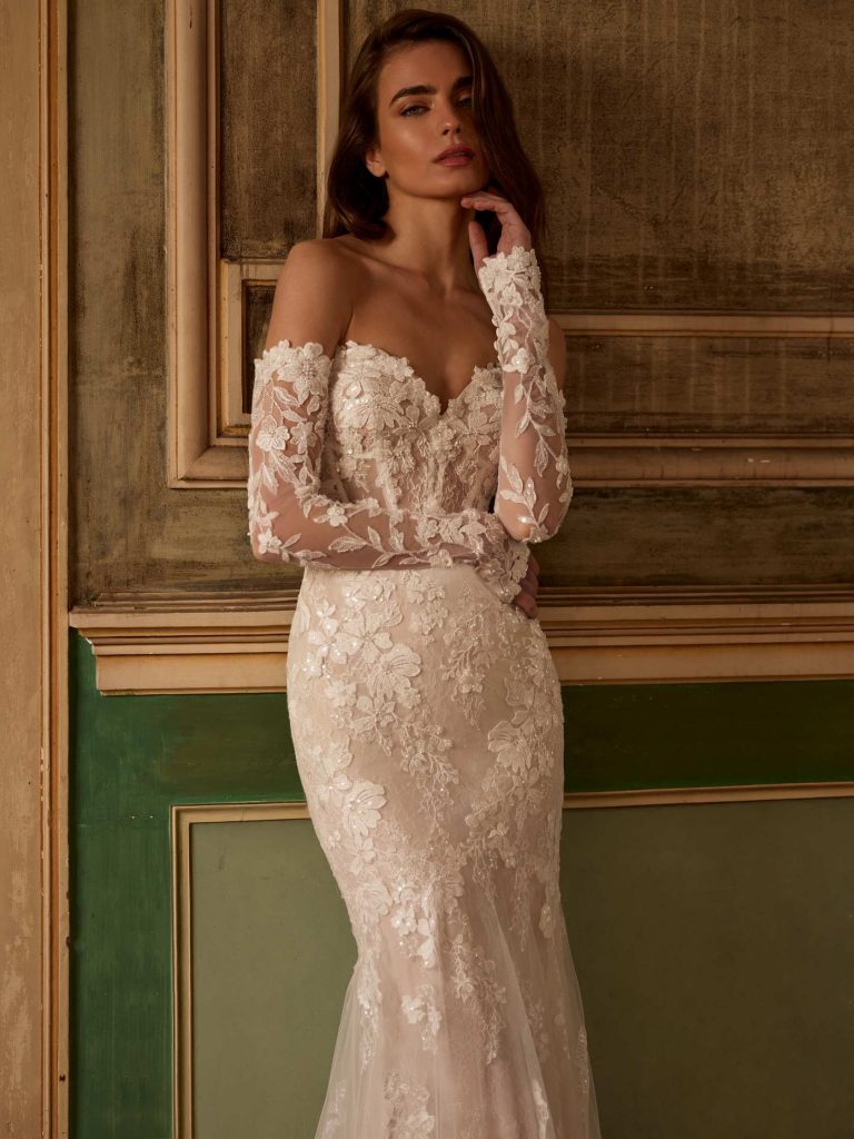 Abito da sposa manica decolte, stile sirena, scollatura spalle aperta e tessuto pizzo