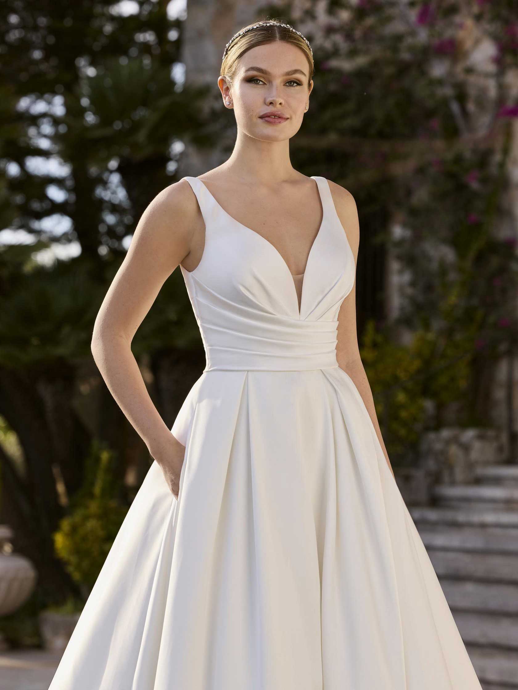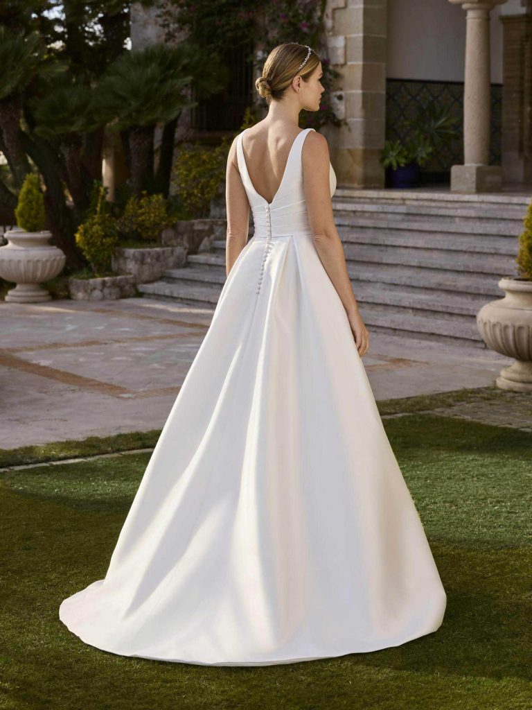 Abito da sposa manica canotta, stile semplice, scollatura spalle aperta e tessuto mikado