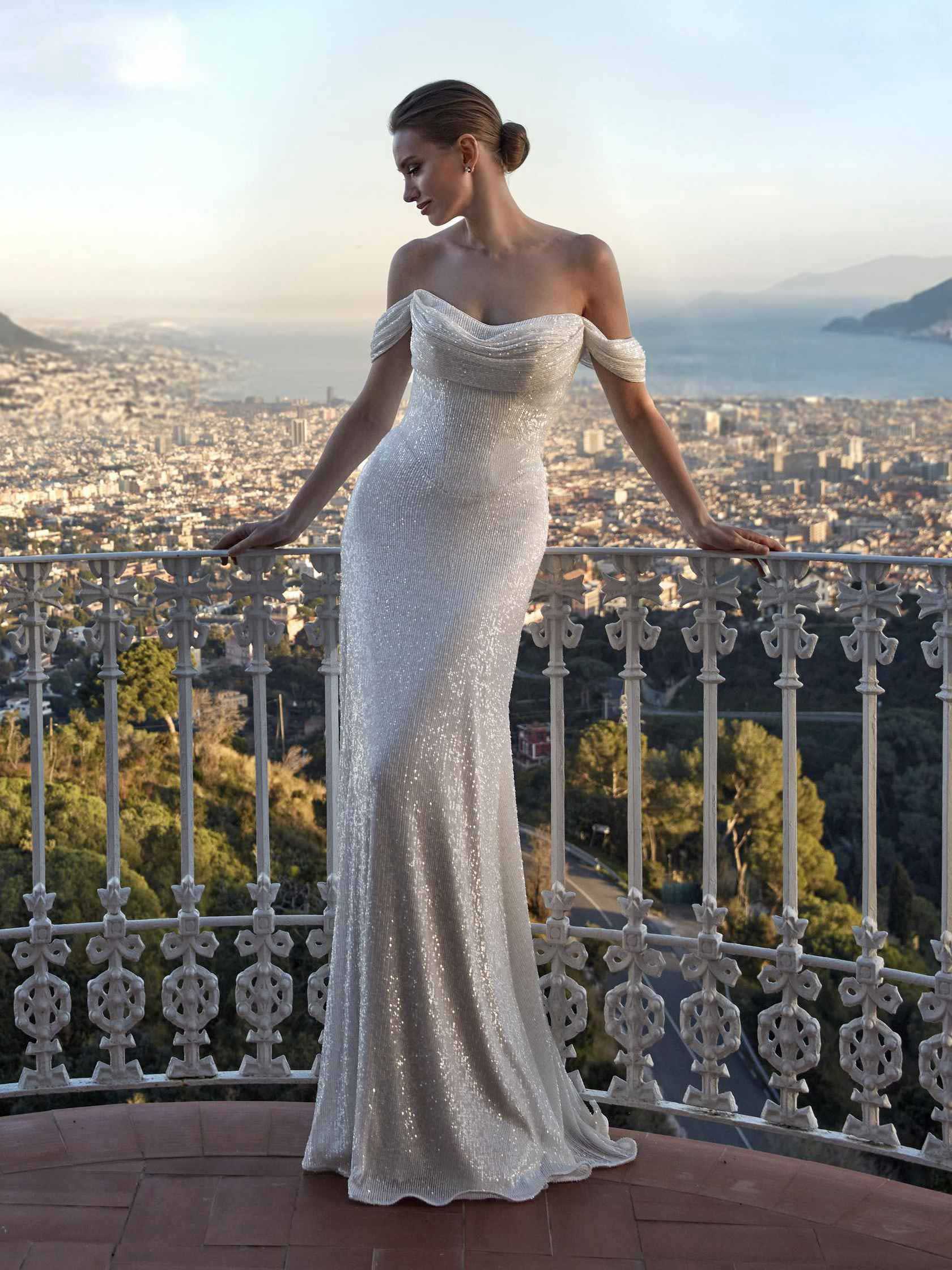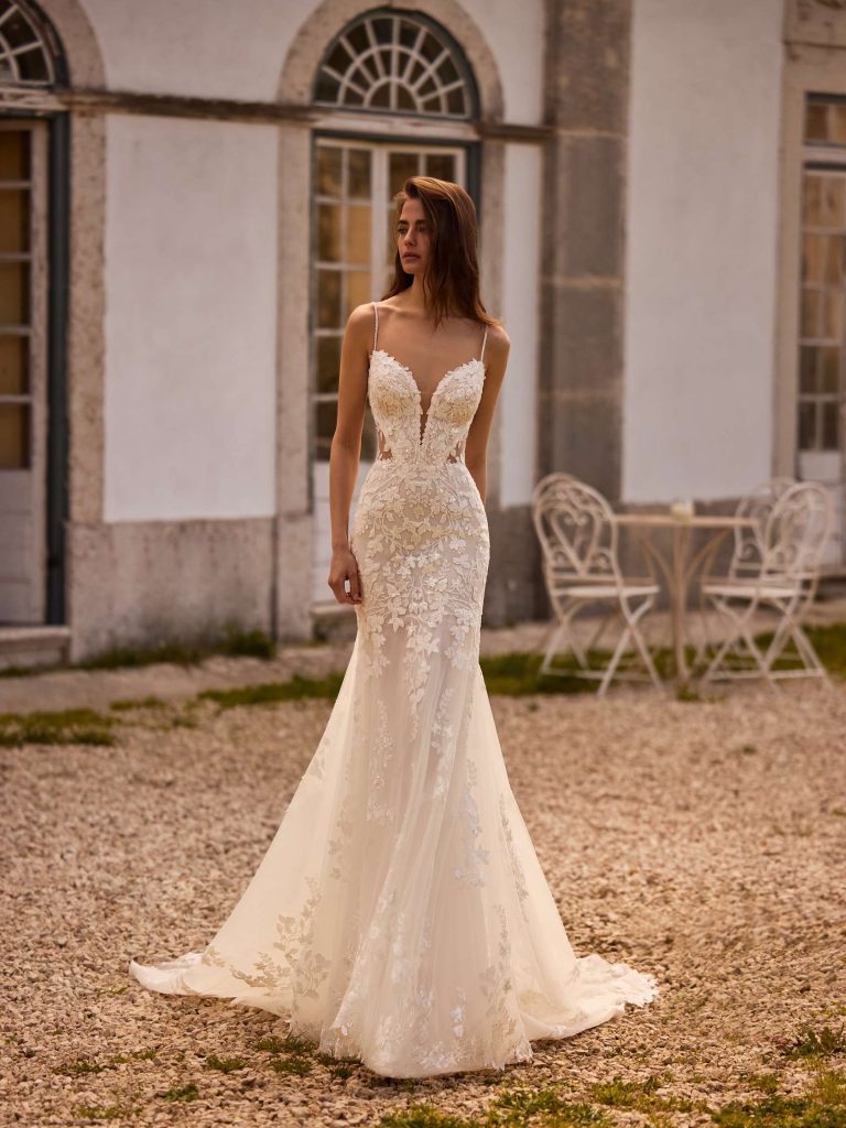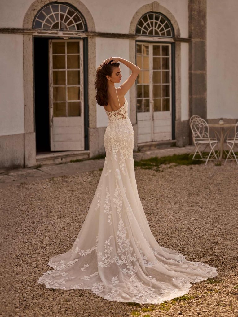 Abito da sposa manica bretelle, stile sirena, scollatura spalle aperta e tessuto pizzo