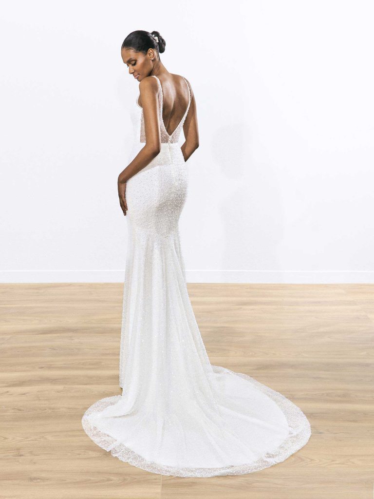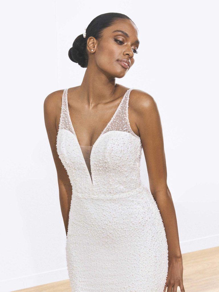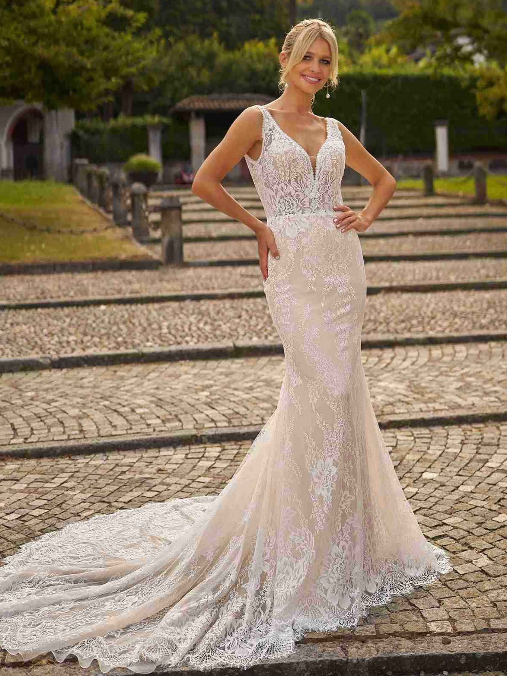 Abito da sposa manica bretelle, stile sirena, scollatura spalle a v e tessuto satin