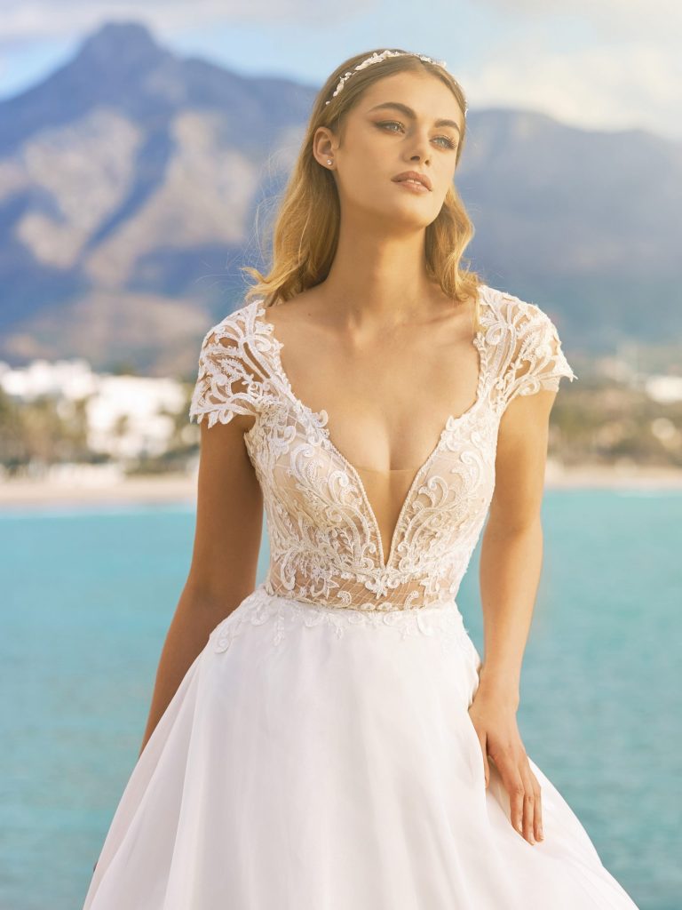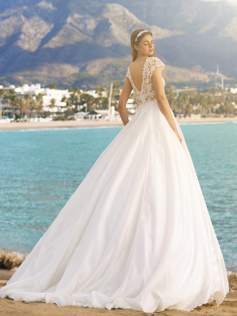 Abito da sposa maniche corte, stile semplice, scollatura spalle a v e tessuto organza