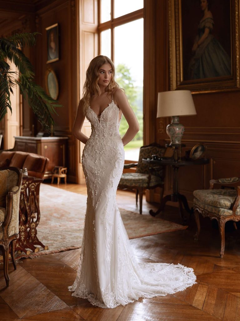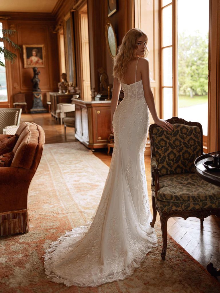 Abito da sposa manica bretelle, stile sirena, scollatura spalle aperta e tessuto pizzo
