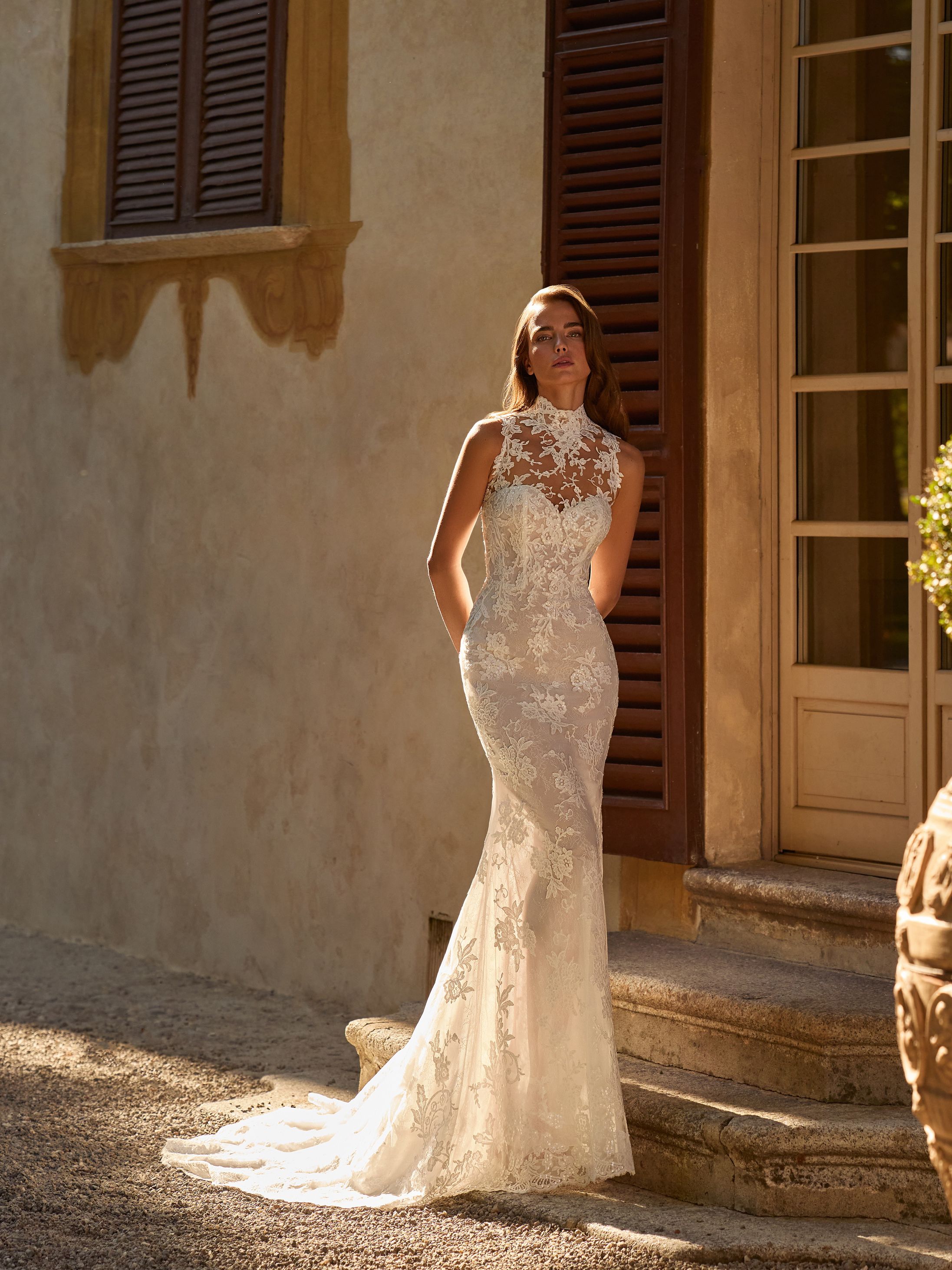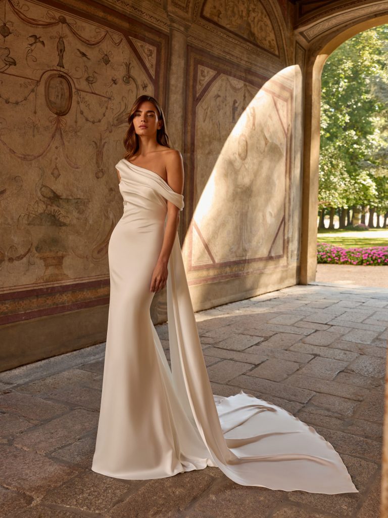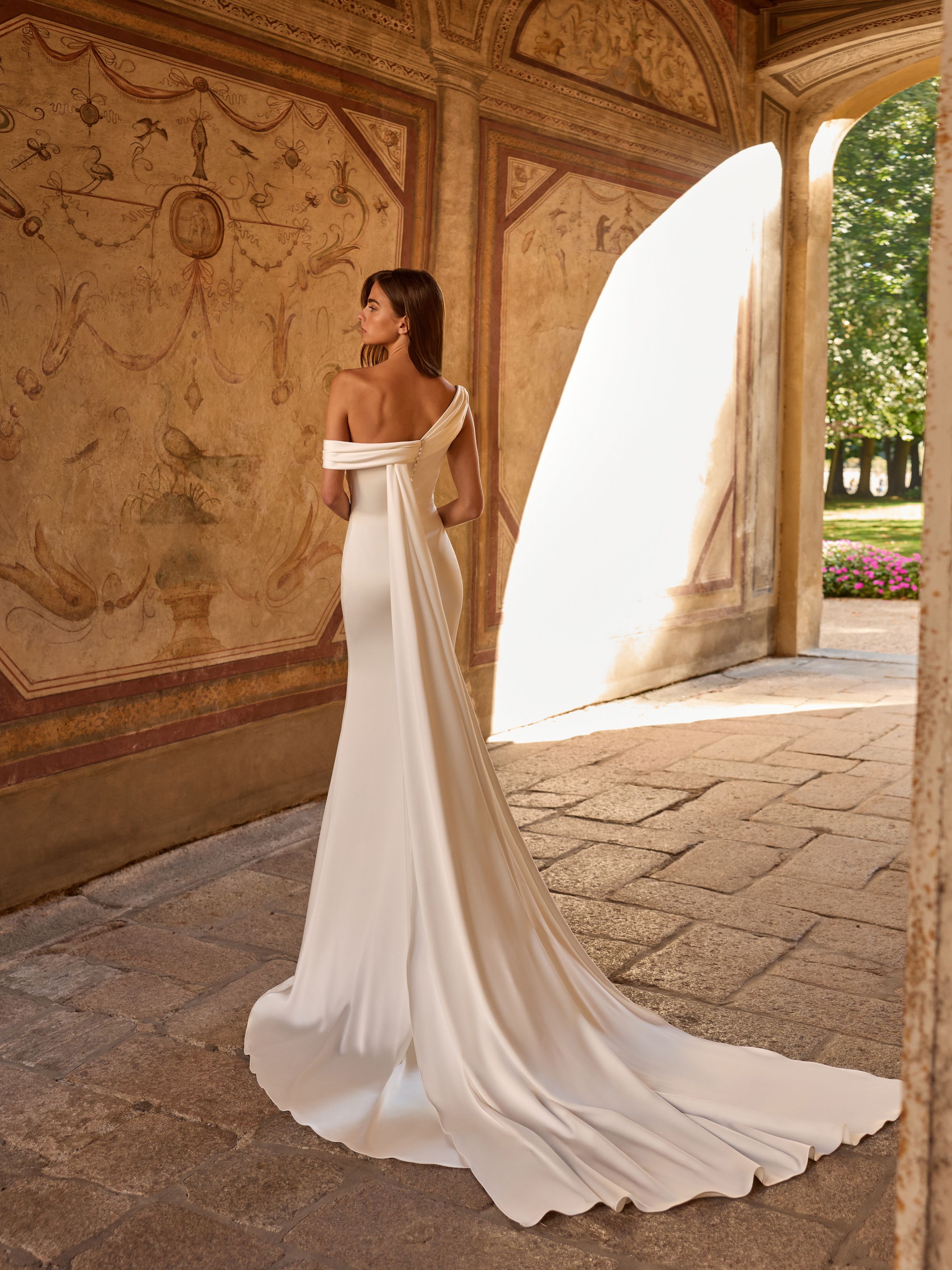 Abito da sposa manica decolte, stile sirena, scollatura spalle aperta e tessuto raso