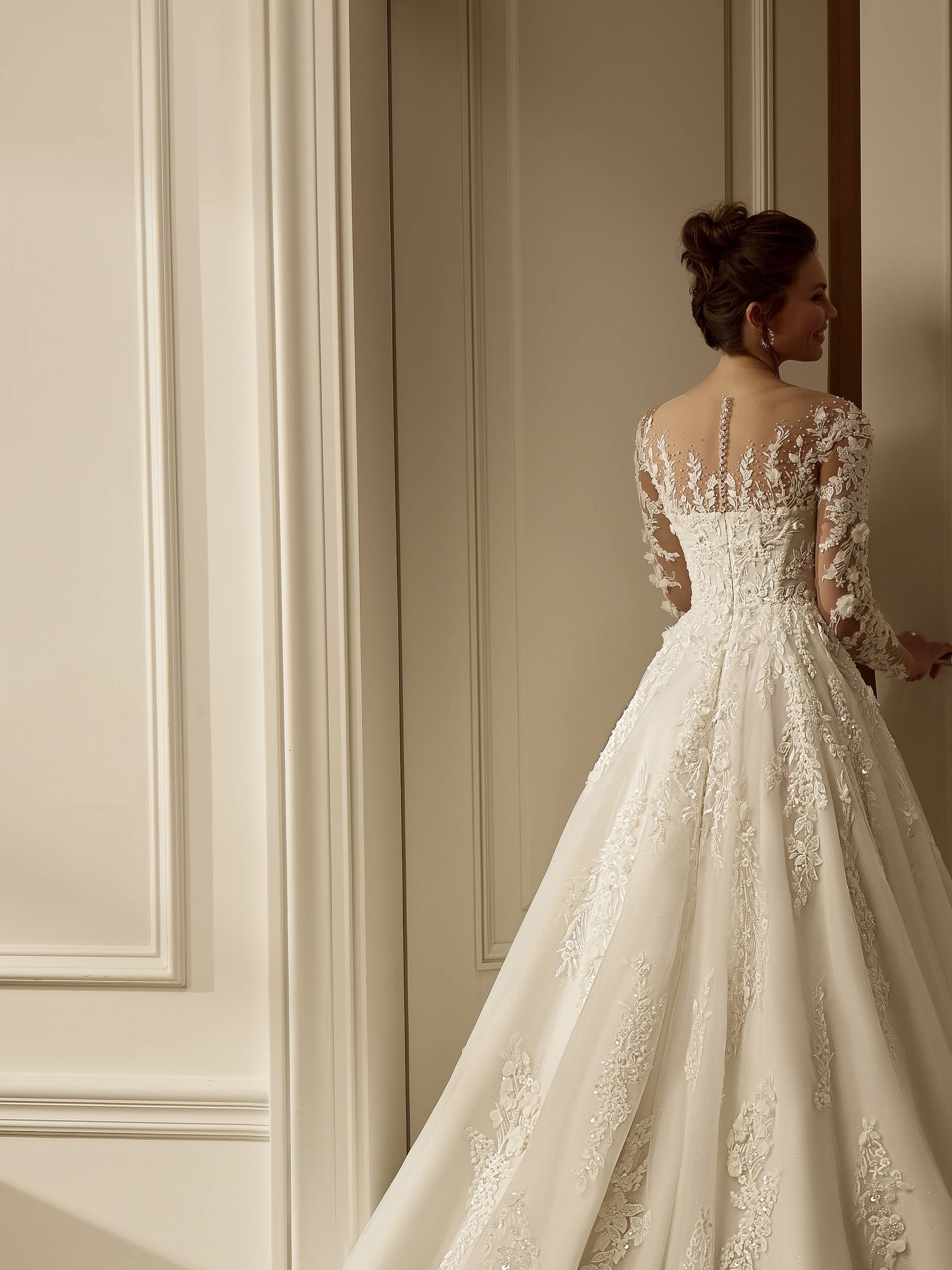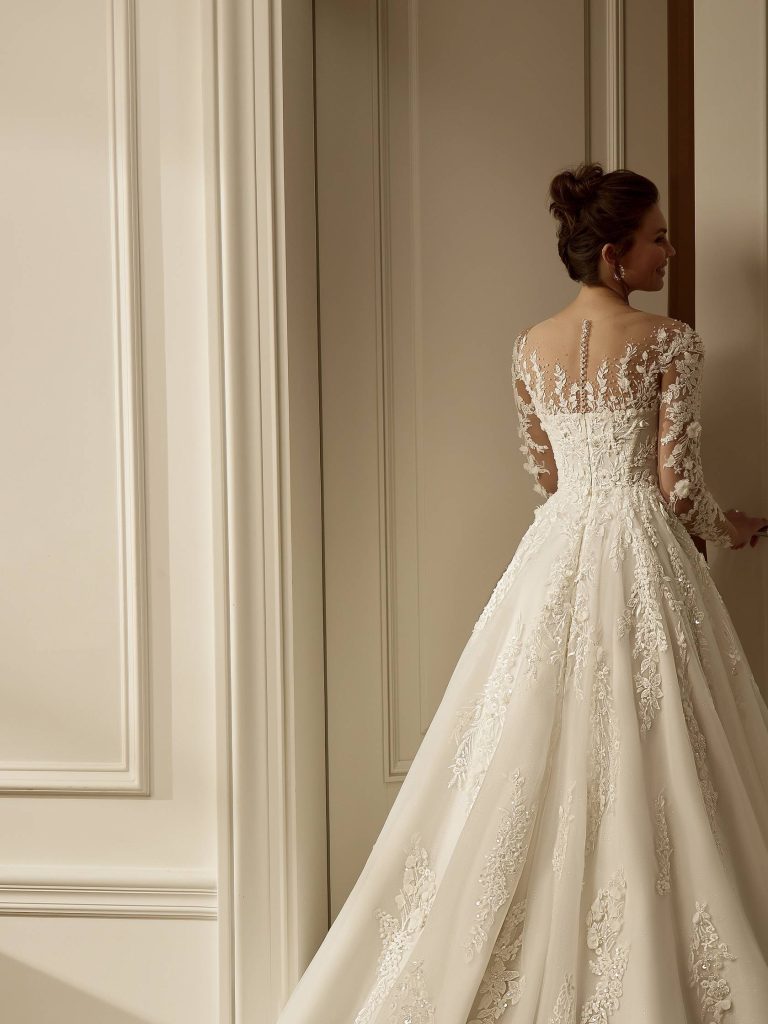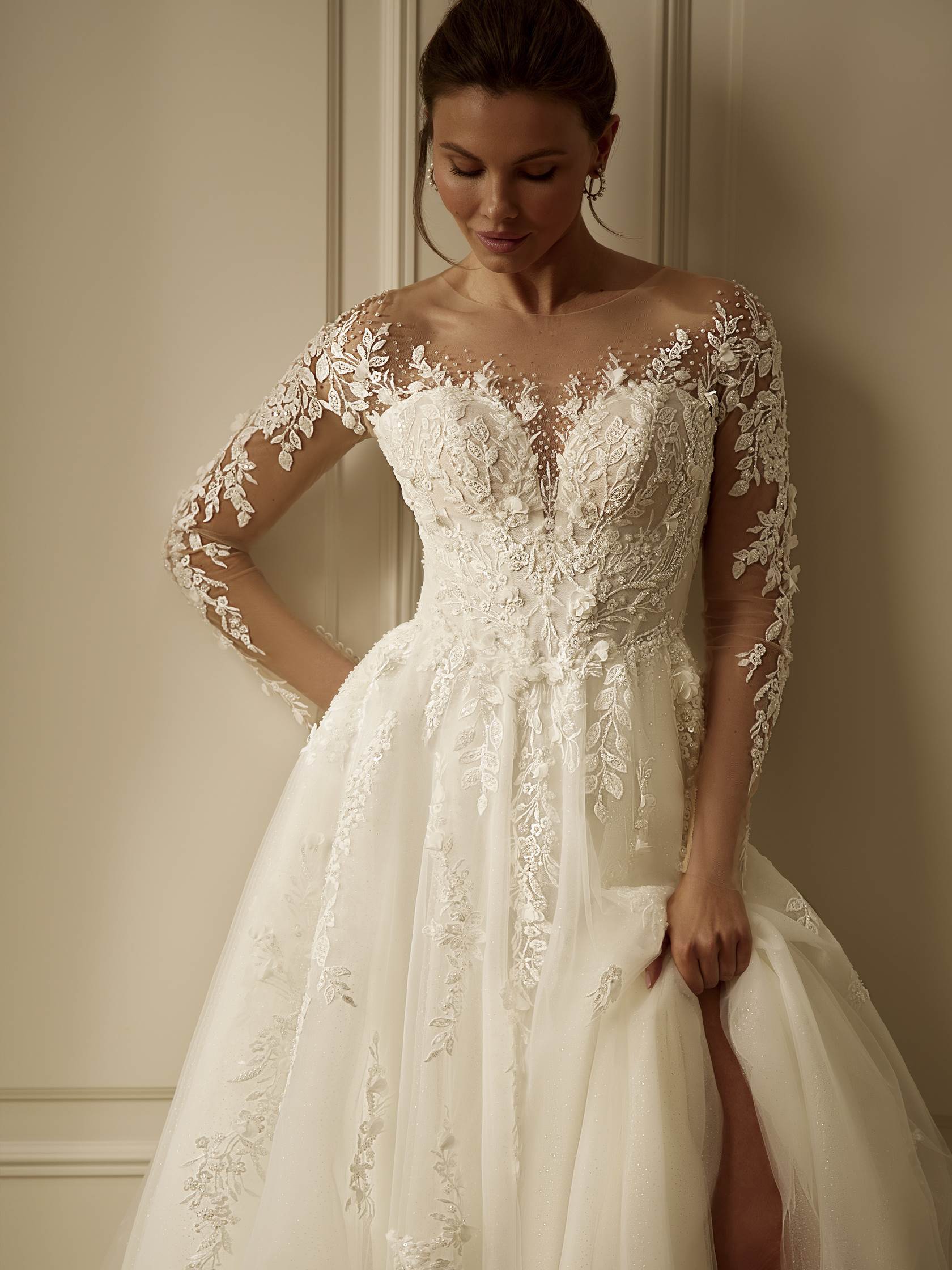 Abito da sposa maniche lunghe, stile principessa, scollatura spalle velata e tessuto pizzo