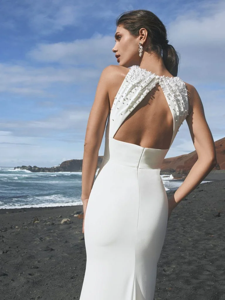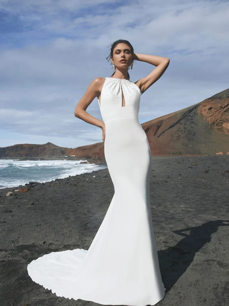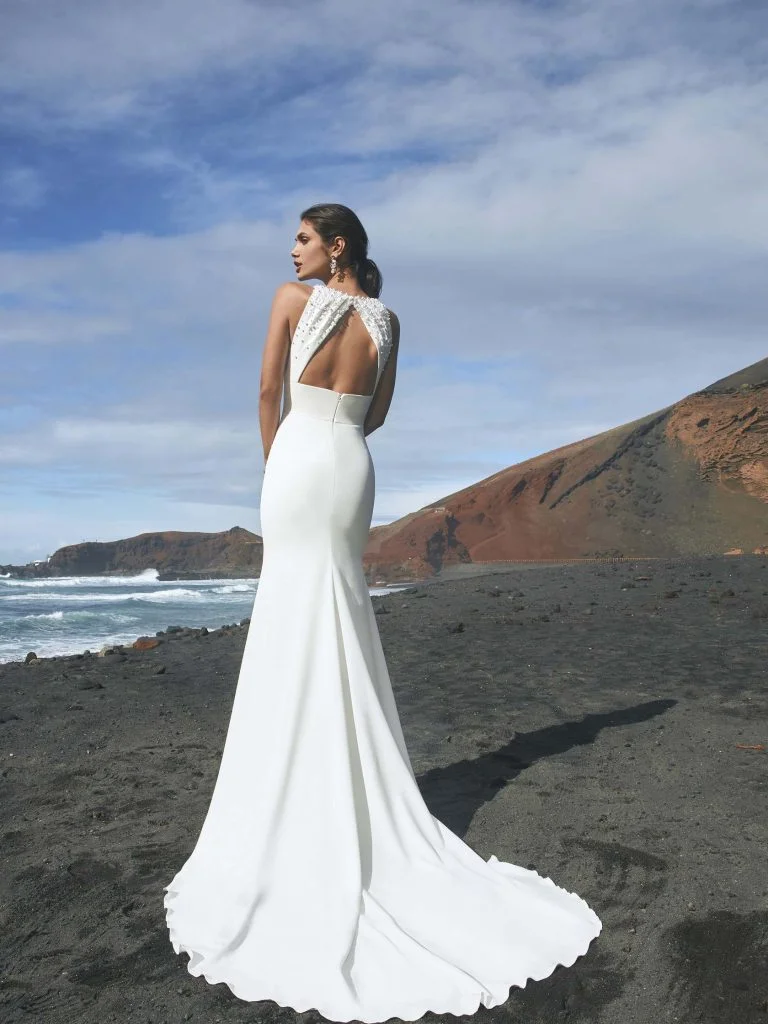 Abito da sposa canotta, stile sirena, scollatura spalle aperta e tessuto georgette