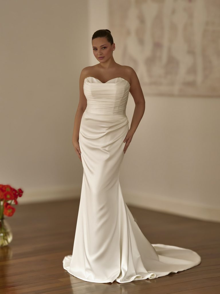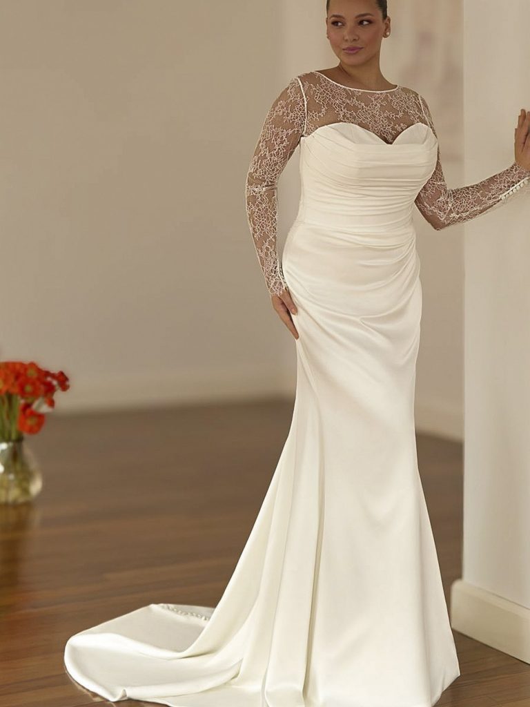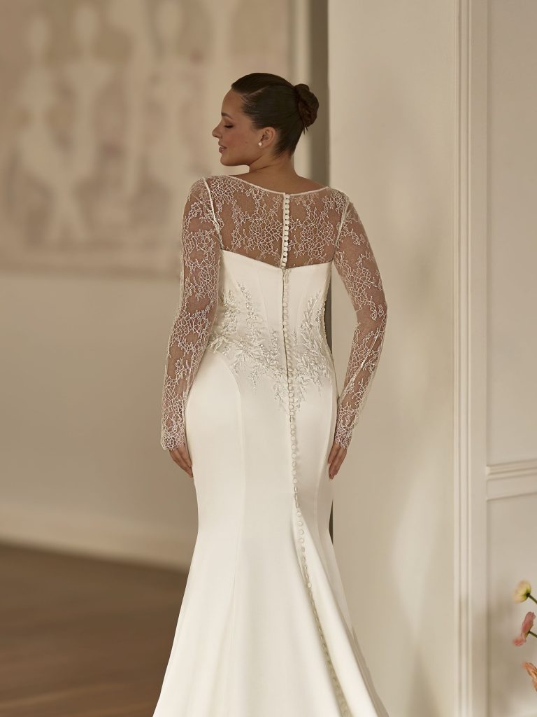 Abito da sposa maniche lunghe, stile sirena, scollatura spalle velata e tessuto mikado