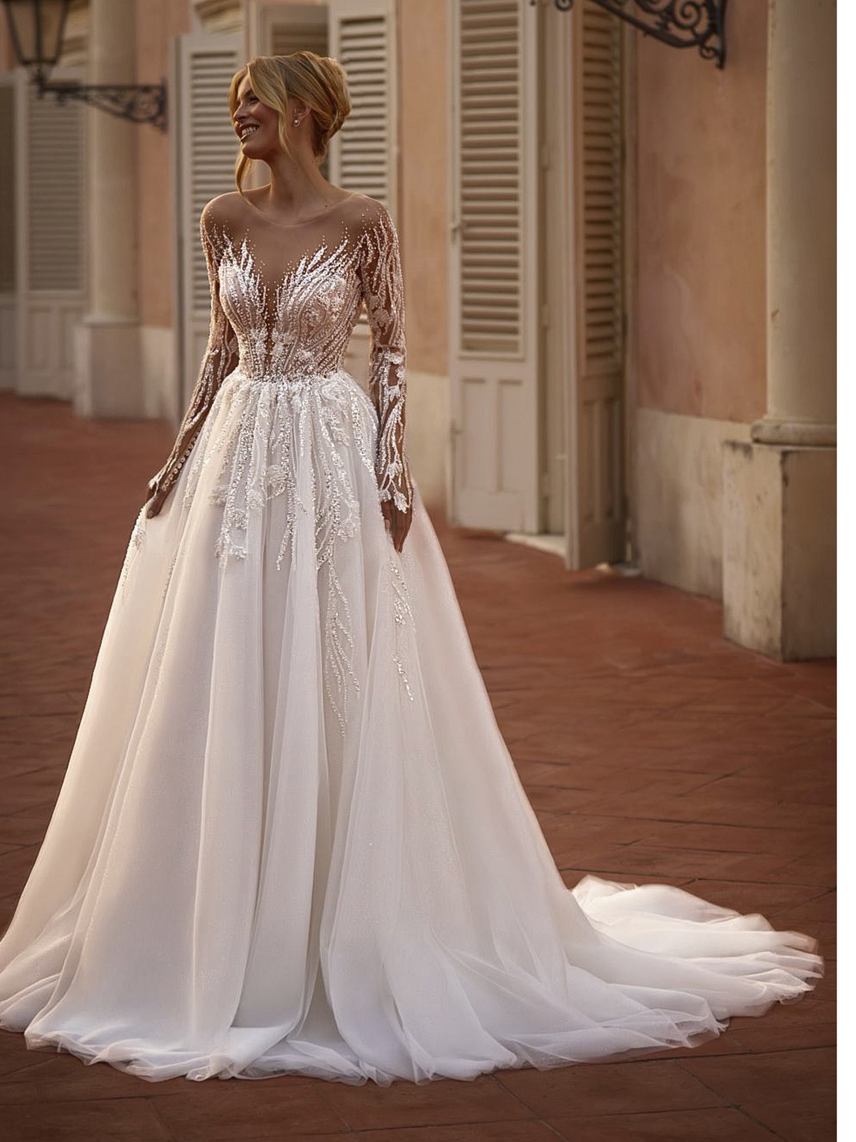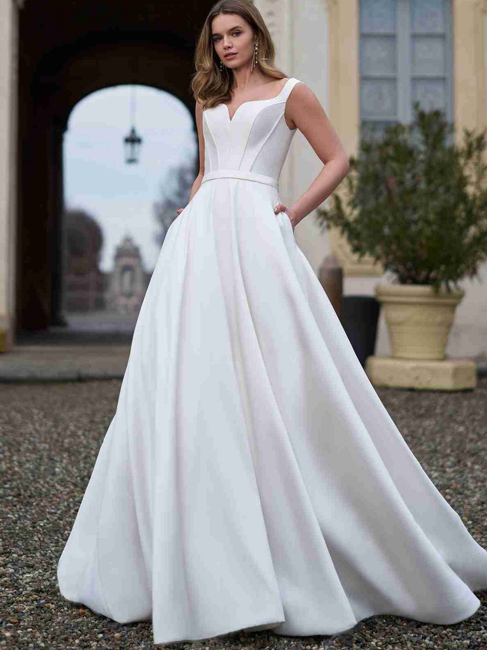 Abito da sposa bretelle, stile romantico, scollatura spalle aperta e tessuto toulle