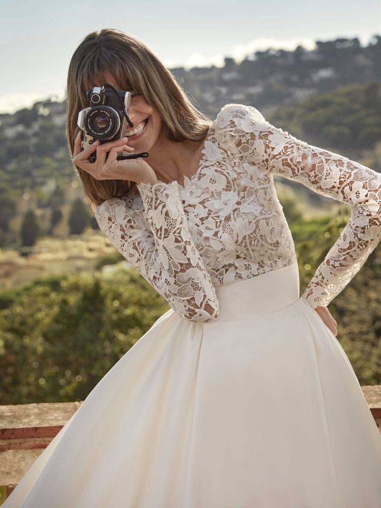 Abito da sposa maniche lunghe, stile semplice, scollatura spalle aperta e tessuto mikado