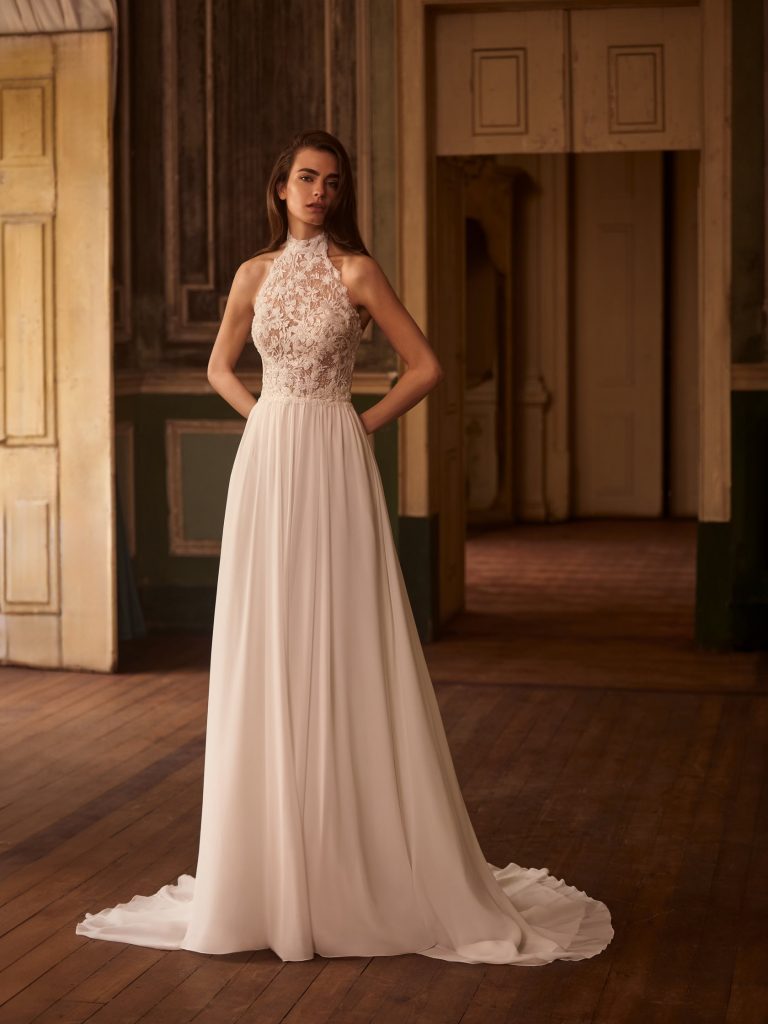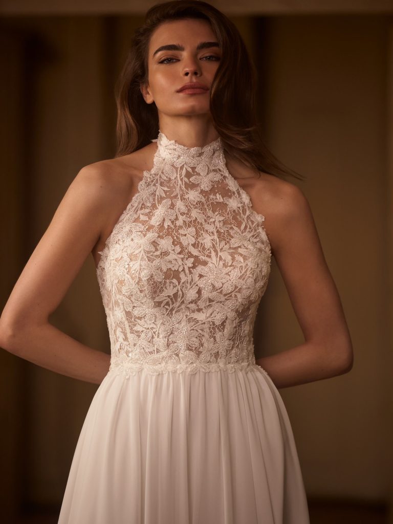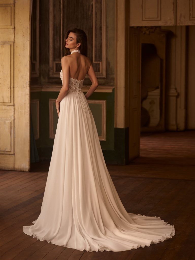 Abito da sposa manica decolte, stile scivolato, scollatura spalle aperta e tessuto organza