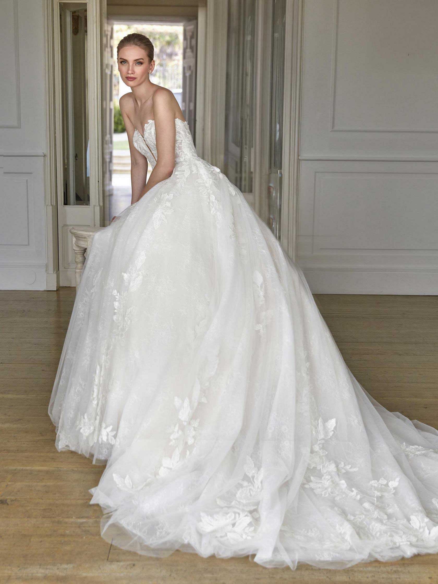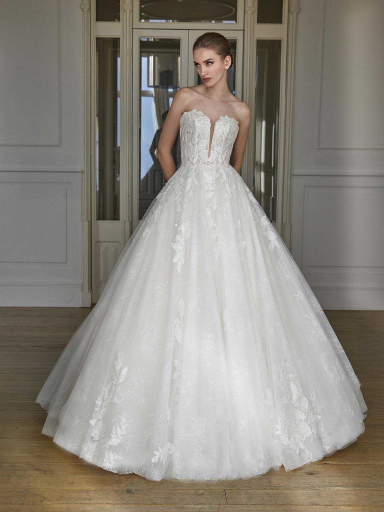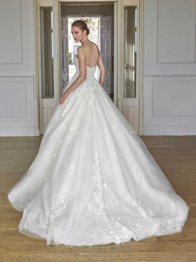 Abito da sposa manica decolte, stile principessa, scollatura spalle aperta e tessuto pizzo