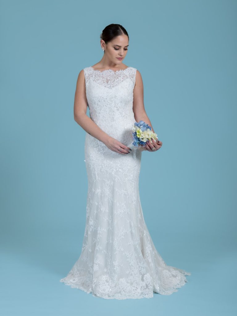 Abito da sposa canotta, stile sirena, scollatura spalle effetto tattoo e tessuto pizzo