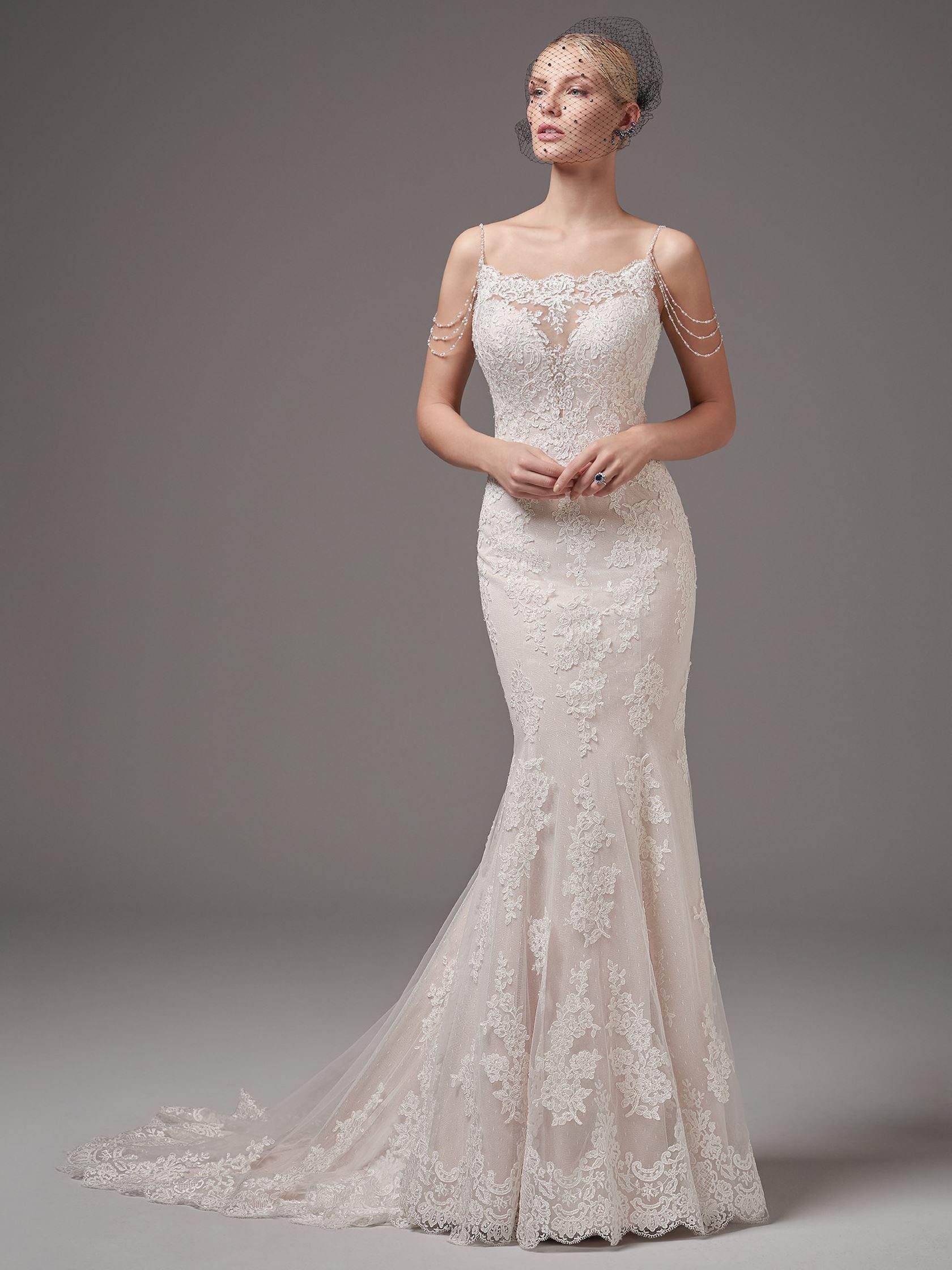 Abito da sposa manica decolte, stile sirena, scollatura spalle aperta e tessuto raso