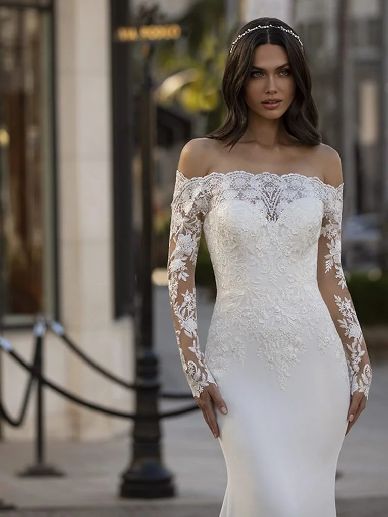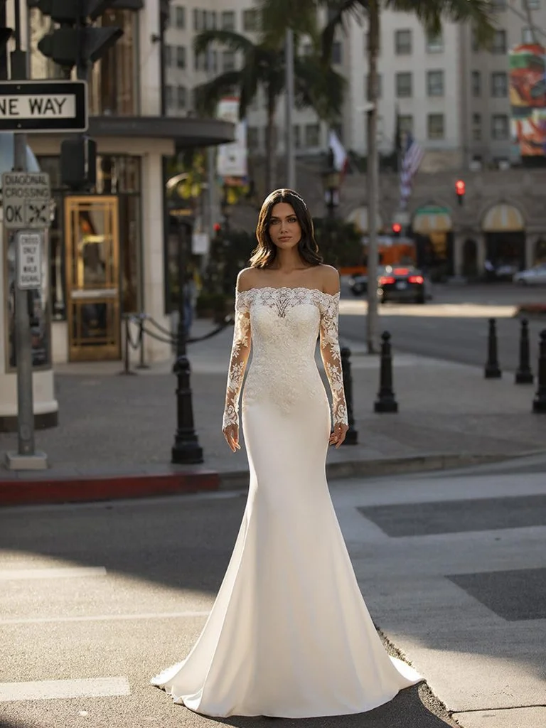 Abito da sposa maniche lunghe, stile sirena, scollatura spalle velata e tessuto crepe