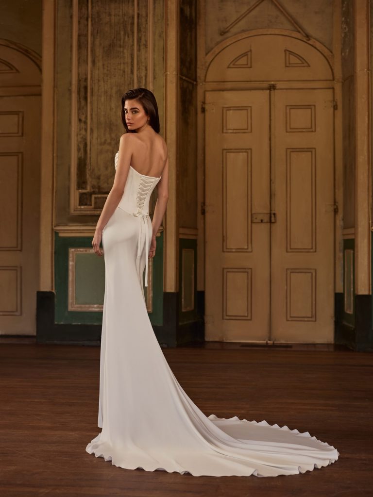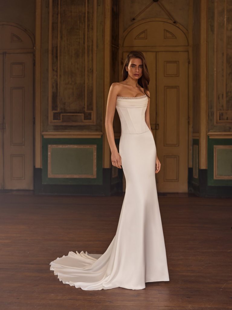 Abito da sposa manica decolte, stile sirena, scollatura spalle aperta e tessuto raso