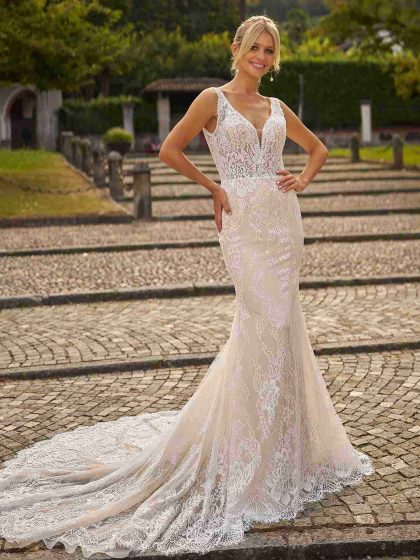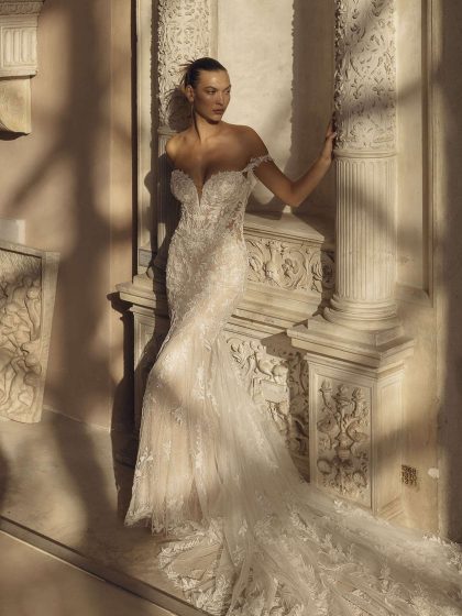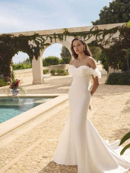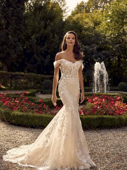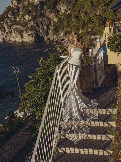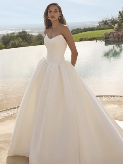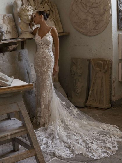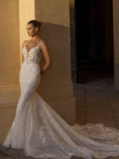 Design eleganti e puliti si affiancano a intricati capolavori in pizzo, offrendo un abito per ogni passione. Modelli a sirena e svasati scolpiscono e valorizzano il corpo, mentre giochi di gonne staccabili e modelli corti esprimono un tocco fresco e alla moda.