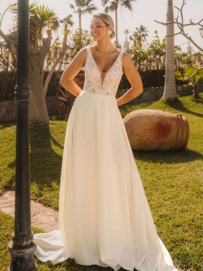 Gli abiti da sposa in stile scivolato sono caratterizzati da linee morbide che cadono sul corpo senza essere troppo aderenti ma esaltando le tue forme e donando uno stile elegante alla sposa. I tessuti sono leggeri e fluenti, come lo chiffon, il toulle o l’organza, grazie alla leggerezza dei tessuti i movimenti dell’abito da sposa scivolato sono fluidi e leggeri, ben si prestano a delle foto all’area aperta piene di movimento. Un modello quello scivolato, che si adatta a tutte le fisicità ed è perfetto anche per una sposa in dolce attesa o per chi vuole un matrimonio romantico.